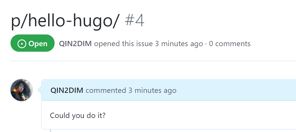 值得一提的是,如果你此时正在本地运行 hugo server,有人在 issue 中发送新的留言,你能直接在 local server 中接收到这个信息,意味着你的文章评论区会直接渲染出更新的内容(如果你是 fast render 模式,需要刷新一下页面)。 同理,已经部署发布的站点也能收到这些讯息(实时更新)。