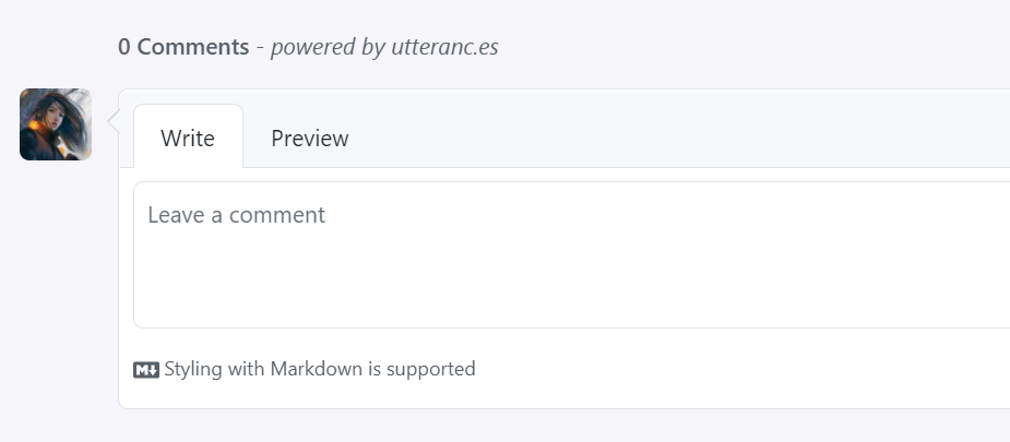 # ~/config.yaml # 再次声明,本博客使用 Stack 主题作为分享参考,此主题使用.yaml 格式配置文件,且预先写好了 utterances 接口网页,意味着仅需改动配置文件就能使用。 # 如果你至此的所有环境与操作都与作者相同,那恭喜你马上就要通关了! # 如果你的主题用其他格式文件,注意语法的调整。 # 如果你的主题没有携带 utterances 脚本代码,请在~/layouts/partials/comments/provider/ 目录下新建一个 utterances.html 文件,并在里面输入下一个代码块中的内容。如何判断你的主题是否支持 utterances 呢? 查看 ~/themes/<your-theme>/layouts/partials/comments/provider/ 目录下是否存在 utterances.html 既可。 # 全局配置 params: # 留言系统设置 comments: enabled: true # 评论系统提供商。目前支持的有:disqus utterances remark42 vssue waline twikoo giscus gitalk provider: utterances # 关于 utterances 的具体配置 utterances: # repo 必填项,指向你的`comments-repo`,参照写法如 qin2dim/blog-comments 注意别加.github.io repo: <GithubUserName>/<RepositoryName> # issueTerm: 必填项,issue标题的切分规则,可写 pathname title url issueTerm: pathname # theme 必填项,评论区的主题 # 可选 github-light github-dark preferred-color-scheme # github-dark-origin lcy-dark dark-blue photon-dark boxy-light theme: github-light # label 可选项,提交的issue的默认标签,不填则不打标签。 label:// utterances.html template of theme, Stack <script src="https://utteranc.es/client.js" repo="{{ .Site.Params.comments.utterances.repo }}" issue-term="{{ .Site.Params.comments.utterances.issueTerm }}" {{ with .Site.Params.comments.utterances.label }} label="{{ . }}" {{ end }} crossorigin="anonymous" async > </script> <style> .utterances { max-width: unset; } </style> <script> function setUtterancesTheme(theme) { let utterances = document.querySelector('.utterances iframe'); if (utterances) { utterances.contentWindow.postMessage( { type: 'set-theme', theme: `github-${theme}` }, 'https://utteranc.es' ); } } addEventListener('message', event => { if (event.origin !== 'https://utteranc.es') return; setUtterancesTheme(document.documentElement.dataset.scheme) }); window.addEventListener('onColorSchemeChange', (e) => { setUtterancesTheme(e.detail) }) </script>Install utterances for your ‘comments-repo’ .