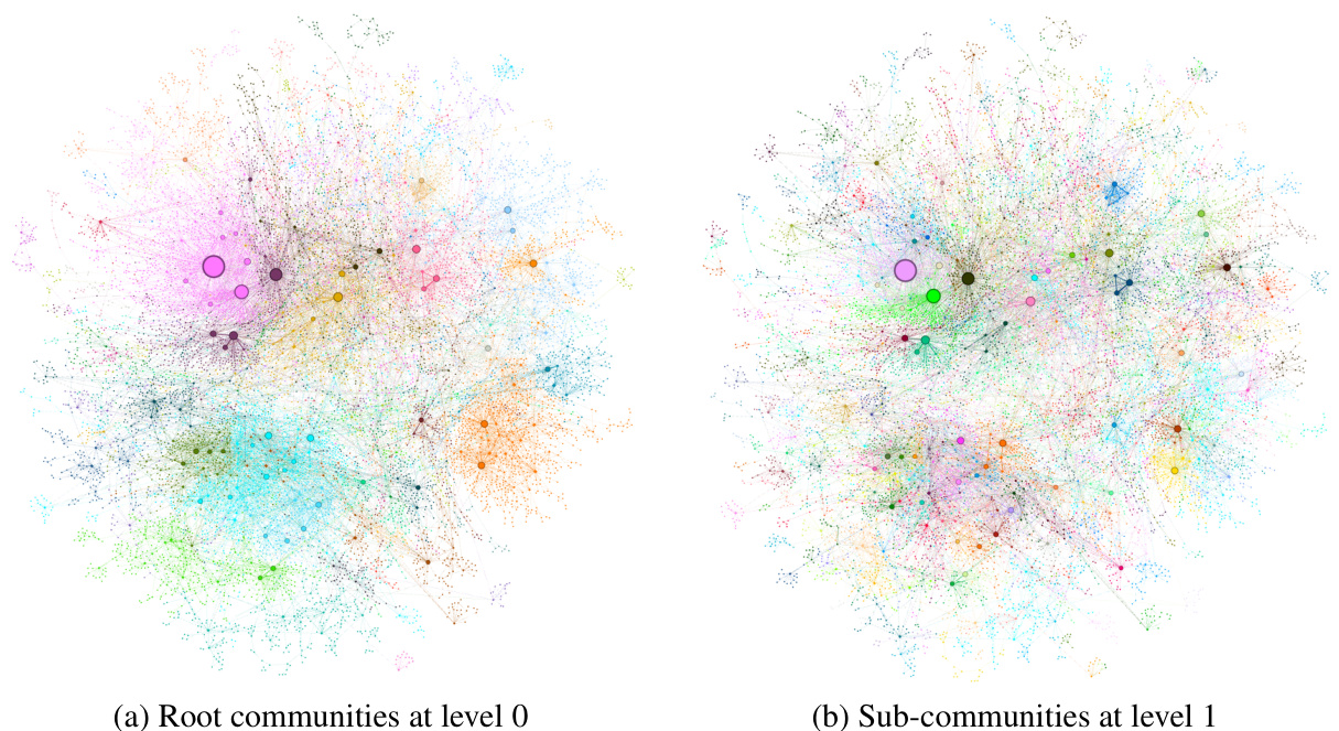 图 3:Leiden 算法在 MultiHop-RAG 数据集上的两层社区划分示意。上图 (a) 表示根社区(level 0),(b) 表示下层子社区(level 1)。