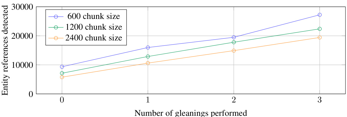 图 2:实体抽取时,不同文本块大小对检测到的实体数量影响。块越大,遗漏的实体越多。