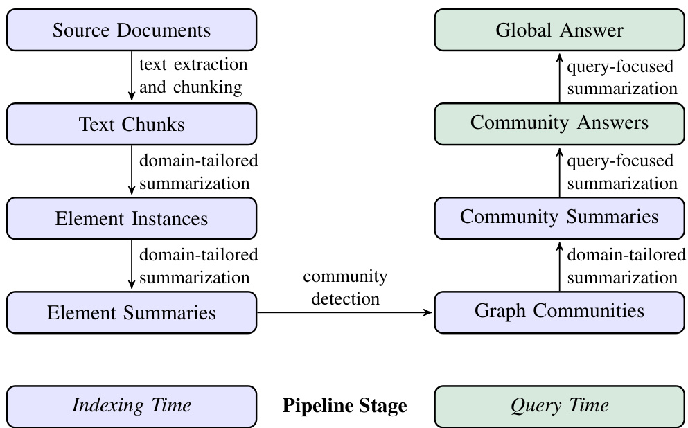 为克服这一问题,一种思路是:在对数据进行索引时,不仅简单做向量嵌入和文本检索,而且要构建出反映实体、关系、事件等关键信息的图结构。之后,利用图的“天然可分块”特性——也就是社区划分,将整个图的节点按照关联度分成彼此紧密关联的社区(community)。对于每个社区,再调用大模型做摘要,以确保对局部有足够的“信息打包”。最后在回答全局性问题时,可以对所有社区的摘要进行二次合并,从而输出“全局视角”的答案。