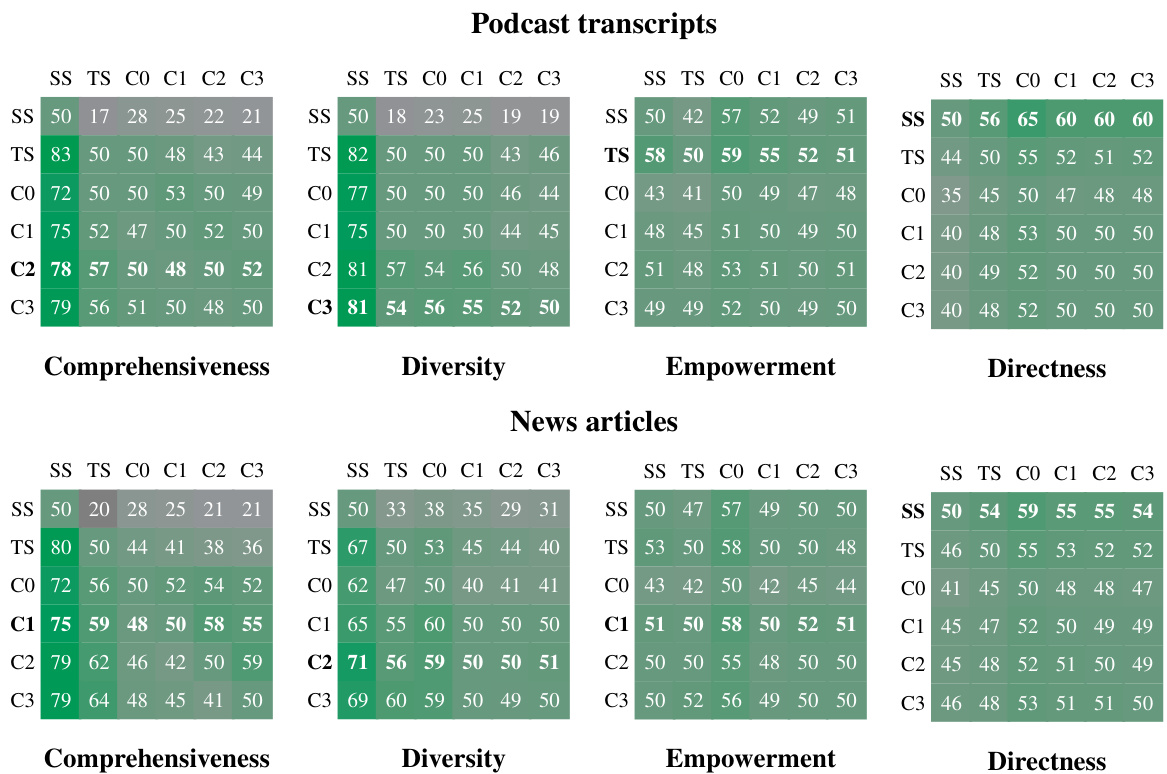 - Diversity(多样性):是否呈现了多元角度或不同子话题?
