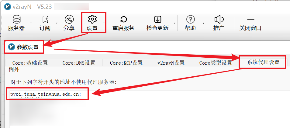 启动代理客户端,依次打开 设置参数设置系统代理设置,在「例外」中填入镜像域名,以清华源 pip 镜像域名为例,填入 pypi.tuna.tsinghua.edu.cn,如下图所示: